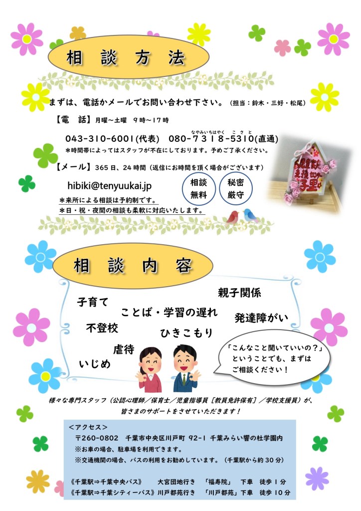 児童家庭支援センター子里は、子どもや子育てをしているご家族、子どものための支援をしている方の相談に乗り、サポートをする機関です。子どもに関する悩みや困りごとは、専門スタッフが対応いたしますので、どうぞお気軽にご相談ください。詳しくは以下の画像をご覧ください。