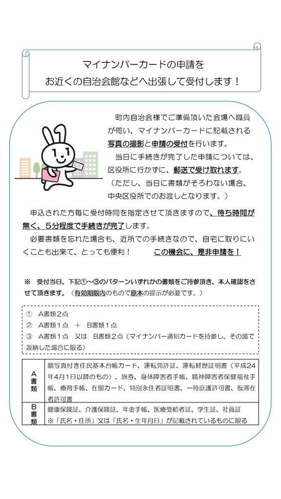 令和3年12月22日(水)、松ケ丘公民館にてマイナンバーカードの出張申請を受け付けます。