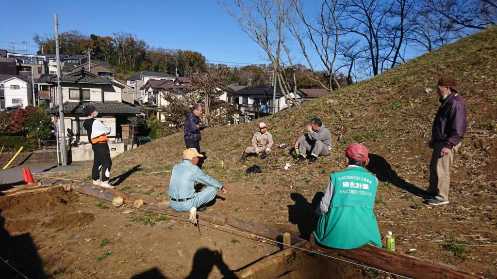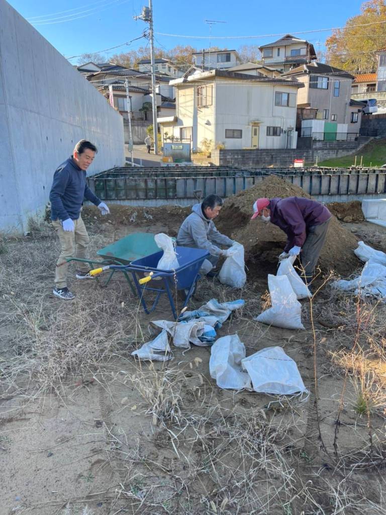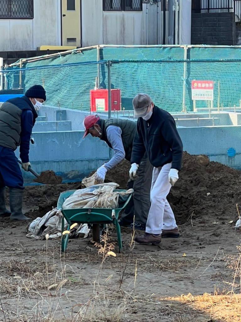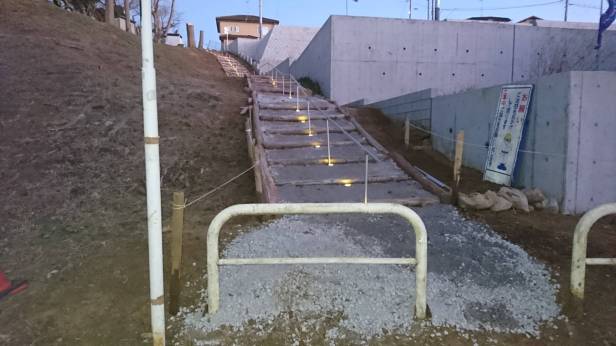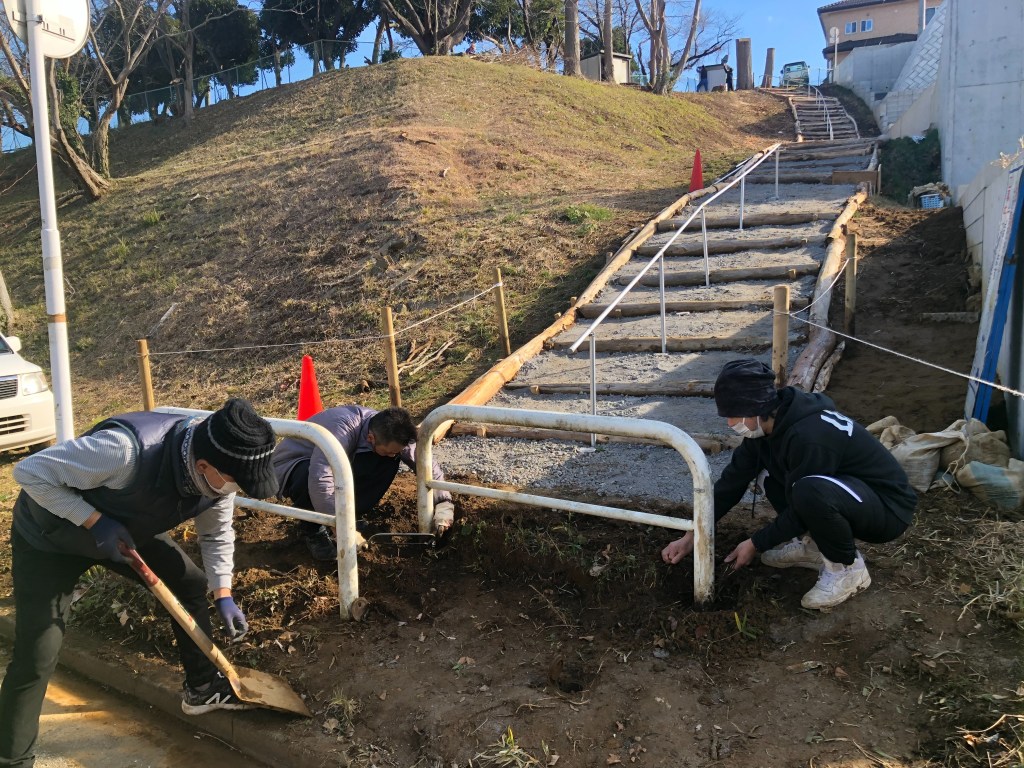 昨年9月の地鎮祭後、地域運営委員会有志の皆様のご協力を得て、仁戸名小学校脇の通学用階段工事を進めています。寒い中での作業は大変ですが、子どもたちが安全に利用できるよう、2月22日(火)の記念式典に向けてがんばっています。