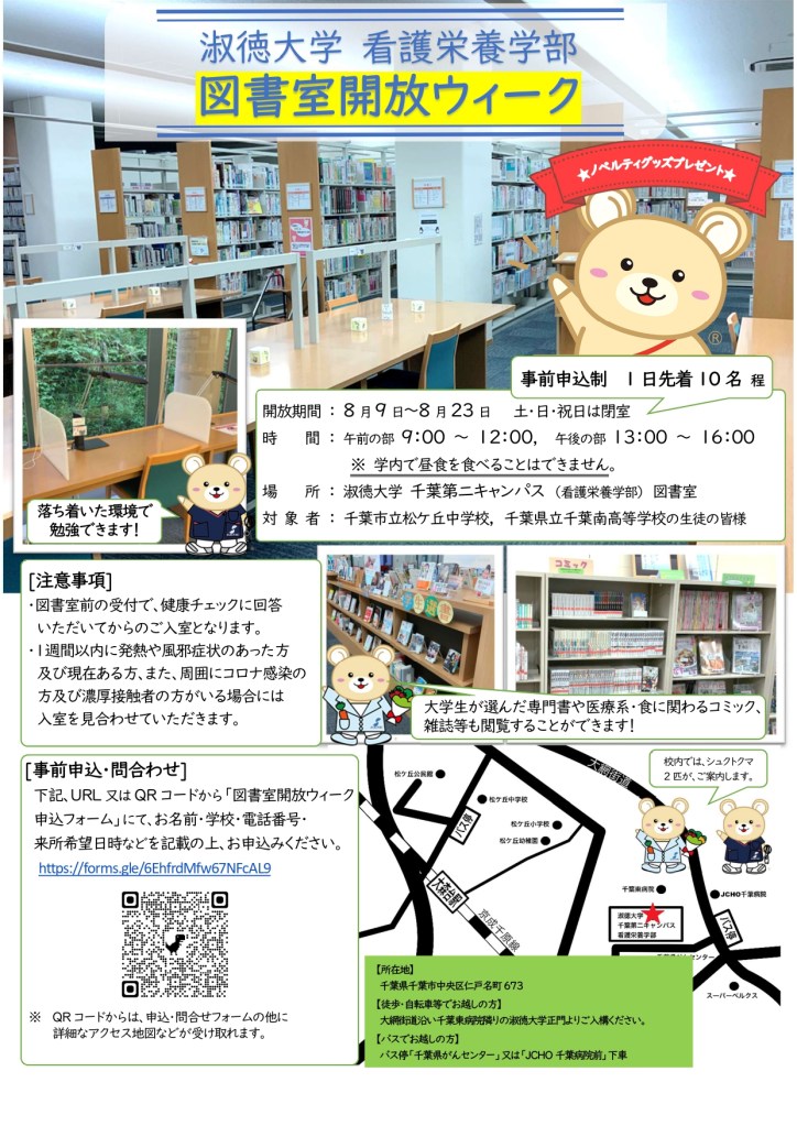 淑徳大学看護栄養学部 淑徳大学看護栄養学部よりご案内 Date: 2022年7月26日Author: 事務局 0 コメント 今年も、図書室開放ウィークを開催します! 開放期間 令和4年8月9日~8月23日 土・日・祝日は閉室 午前の部 9:00~12:00 午後の部 13:00~16:00 場 所 淑徳大学 千葉第二キャンパス(看護栄養学部)図書室 対 象 者 千葉市立松ケ丘中学校・千葉県立千葉南高等学校の生徒の皆様 ※事前申し込みが必要です。(1日先着10名程) ※学内で昼食を食べることはできません。 詳しくは以下をご覧ください。 共有: X で共有 (新しいウィンドウで開きます) X Facebook で共有 (新しいウィンドウで開きます) Facebook いいね 読み込み中… 関連