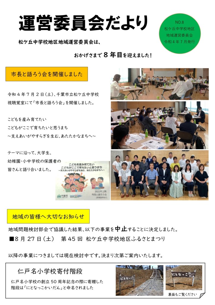 松ケ丘中学校地区地域運営委員会 運営委員会だより No.8 Date: 2022年7月27日Author: 事務局 0 コメント 共有: X で共有 (新しいウィンドウで開きます) X Facebook で共有 (新しいウィンドウで開きます) Facebook いいね 読み込み中… 関連
