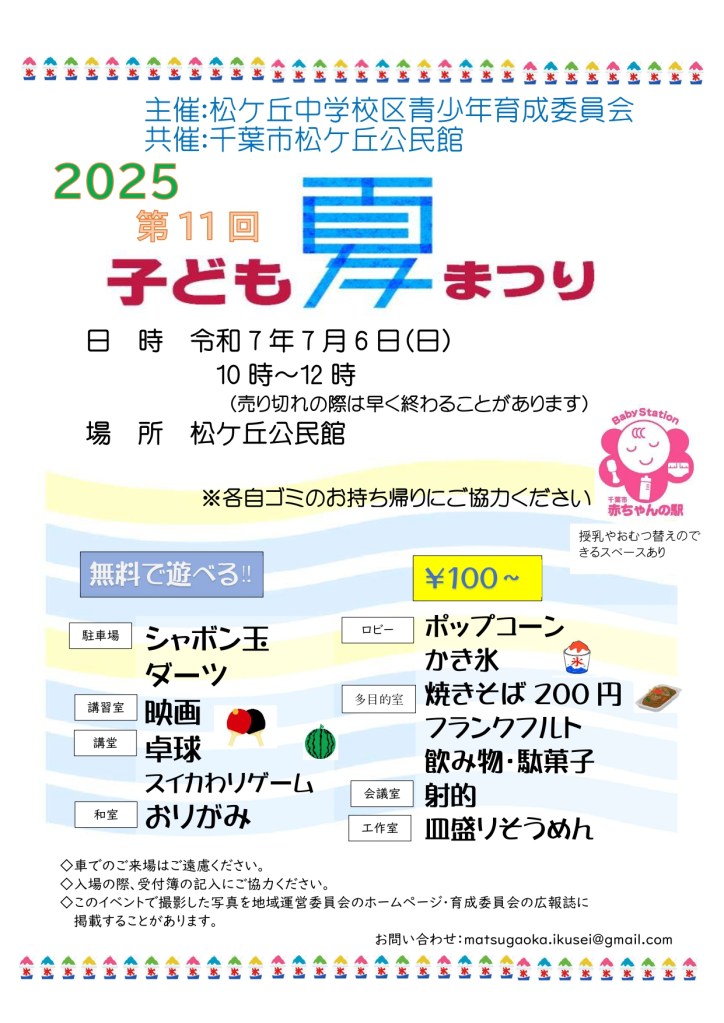 地域の話題, 松ケ丘中学校区青少年育成委員会 第11回 子ども夏まつり Date: 2025年6月25日Author: 事務局 0 コメント 共有: X で共有 (新しいウィンドウで開きます) X Facebook で共有 (新しいウィンドウで開きます) Facebook いいね 読み込み中… 関連