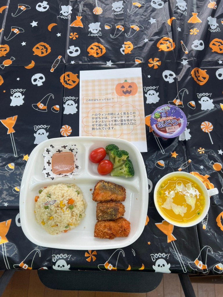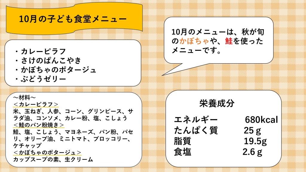 2025年10月18日土曜日、松ケ丘七区睦会自治会館(通称ひだまり)にて子ども食堂を開催しました。淑徳大学看護栄養学部の学生さん考案の秋メニュー「カレーピラフ、鮭のパン粉焼き、カボチャのポタージュ、ぶどうゼリー」です。次回は12月、クリスマスメニューの予定です。