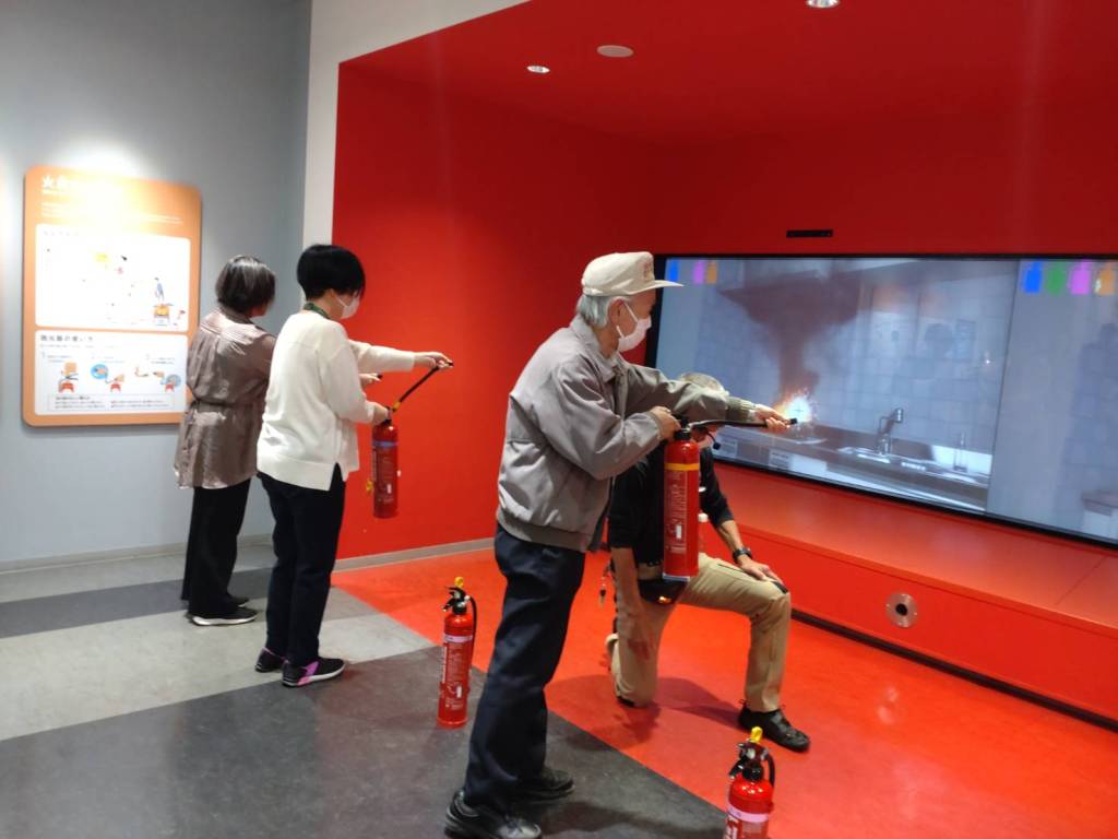 午後は、「横浜市民防災センター」で、地震シミュレーターにて過去の地震や戸建住宅、超高層ビルの揺れなど様々な体験をしました。火災シミュレーターでは、消火器を使った消火体験と、煙からの避難行動を体験しました。