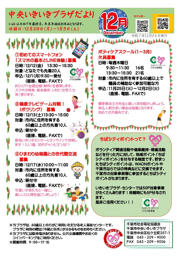 千葉中央いきいきプラザ 中央いきいきプラザだより~12月号~ Date: 2025年12月3日Author: 事務局 0 コメント 共有: X で共有 (新しいウィンドウで開きます) X Facebook で共有 (新しいウィンドウで開きます) Facebook いいね 読み込み中… 関連