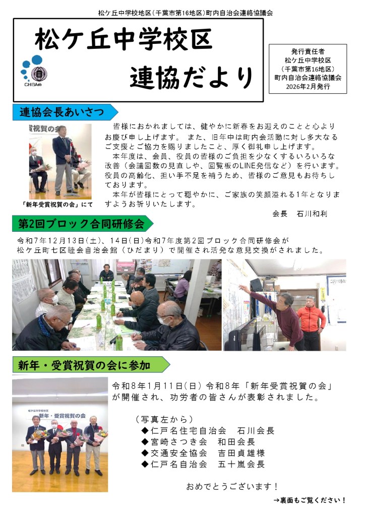 松ケ丘中学校地区地域運営委員会 「連協だより」令和8年2月発行 Date: 2026年2月10日Author: 事務局 0 コメント 共有: X で共有 (新しいウィンドウで開きます) X Facebook で共有 (新しいウィンドウで開きます) Facebook いいね 読み込み中… 関連