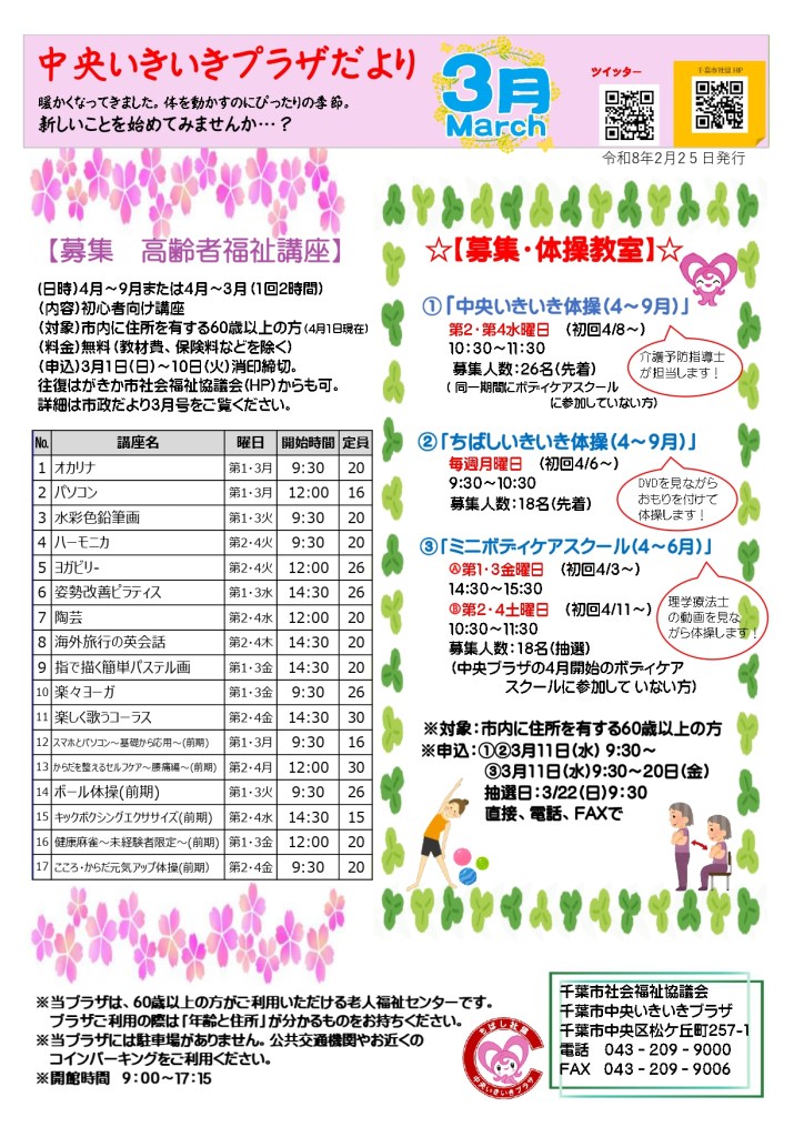 千葉中央いきいきプラザ 中央いきいきプラザだより~3月号~ Date: 2026年2月26日Author: 事務局 0 コメント 共有: X で共有 (新しいウィンドウで開きます) X Facebook で共有 (新しいウィンドウで開きます) Facebook いいね 読み込み中… 関連